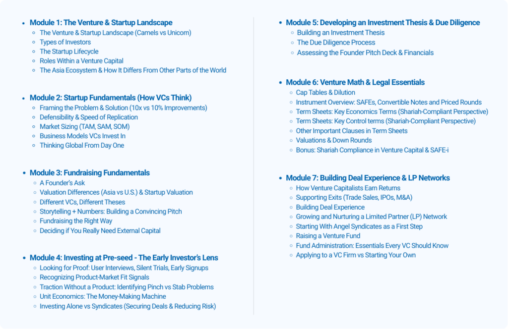 Earn your certification in Venture Capital Fundamentals with HASAN.VC, a leading early-stage investor across Asia. Learn directly from active practitioners through real case studies, gain insights from a shariah-compliant perspective, and receive exclusive access to the HVC Ecosystem.