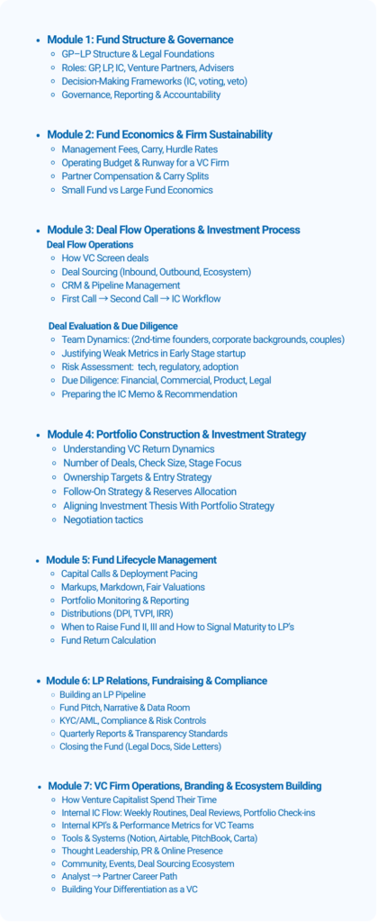 No prior experience in venture capital is required. The program is designed for motivated learners, aspiring investors, founders, operators, or professionals looking to understand how VC works at a practical level.